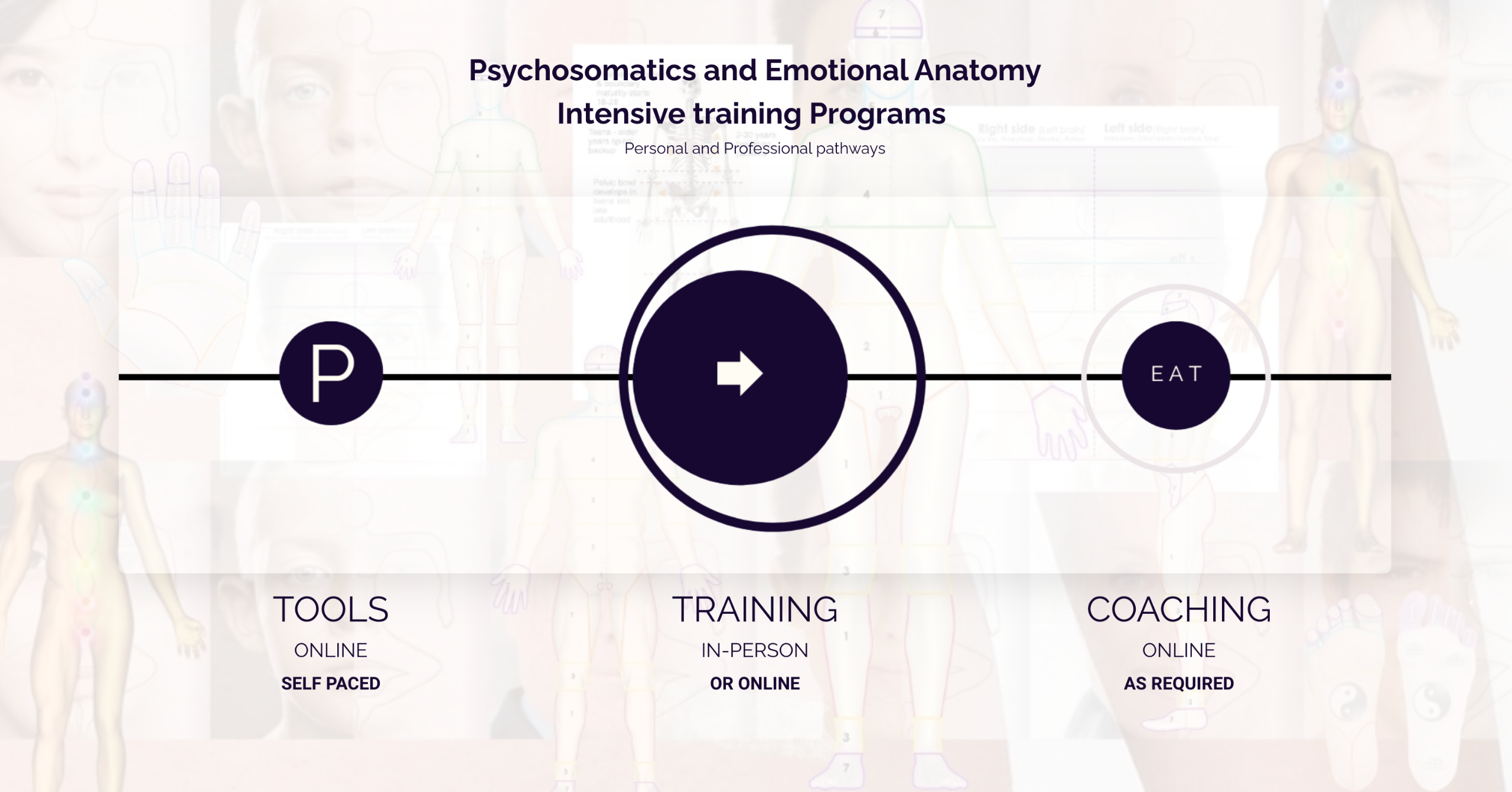 PEAT training programs offer life-changing, comprehensive self-development courses, leading to certification in Psychosomatics & Emotional Anatomy through the Psychosomatic Therapy process.